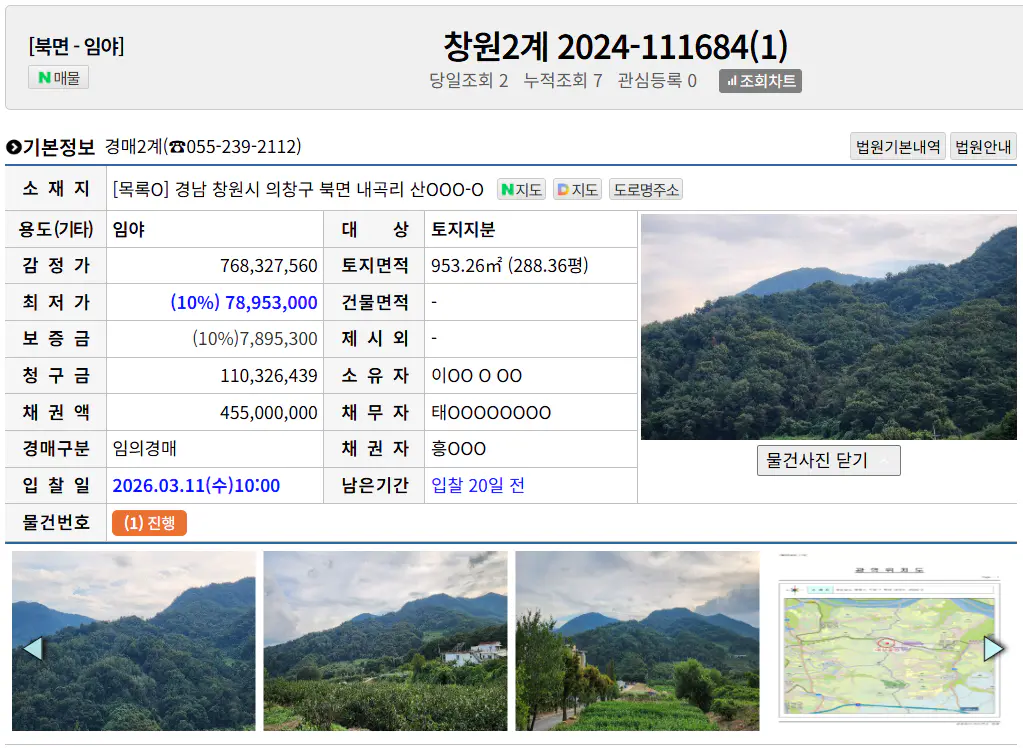 ÇöÀç °æ¸Å·Î ³ª¿Â â¿ø½Ã ÀÇⱸ ºÏ¸é ³»°î¸® »ê255-3ÀÇ ÀÓ¾ß ¹°°ÇÀº ÀÌ Á¡Âï¾î µÐ À§Ä¡¿Í ¸éÀûÀÌ È®Á¤µÈ »óÅÂÀ̹ǷΠÅõÀÚ°¡Ä¡°¡ ºñ±³Àû ¸íÈ®ÇÏ´Ù°í º¼ ¼ö ÀÖ½À´Ï´Ù.